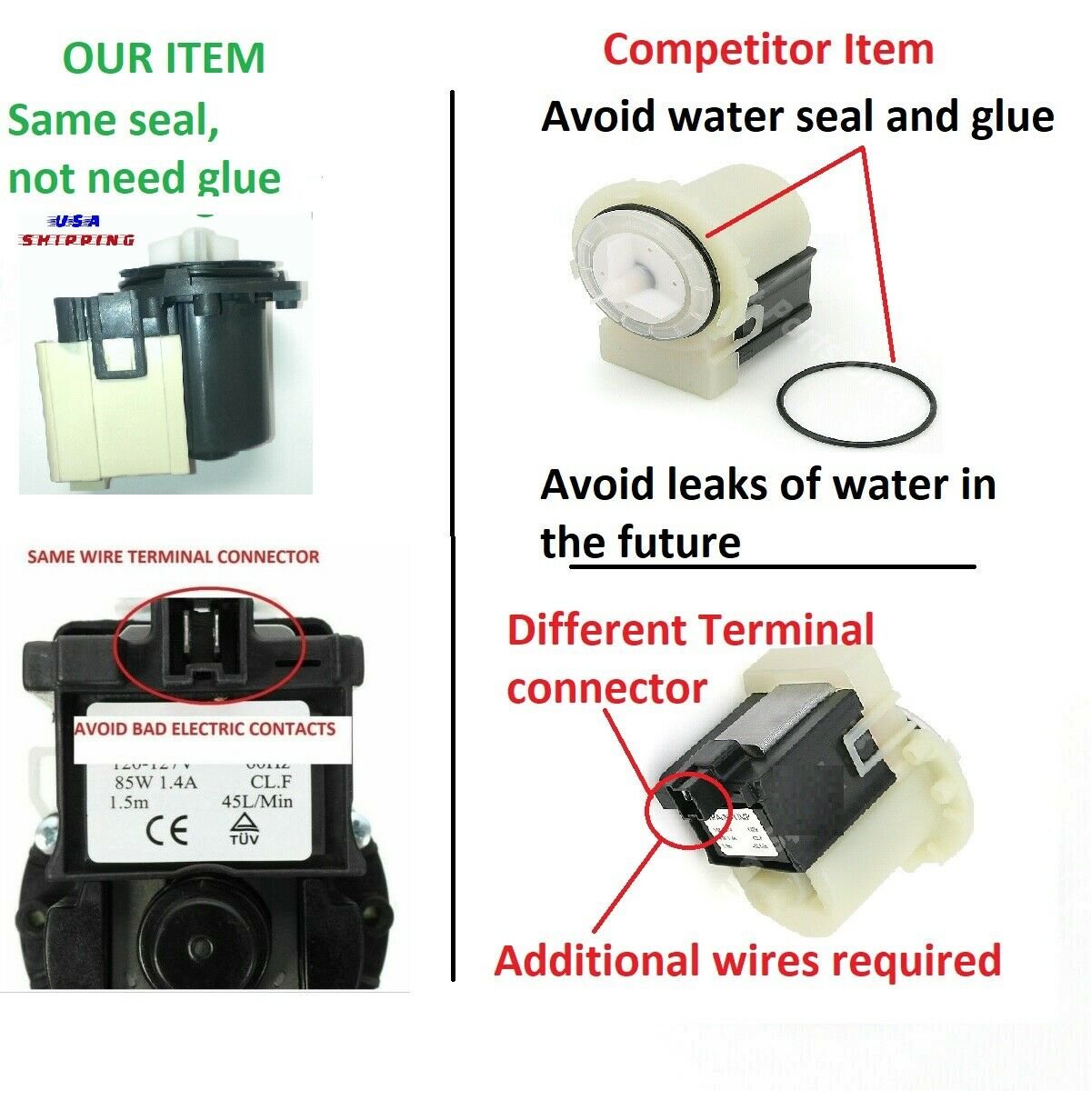 8181684 Whirlpool Washer Drain Pump Assembly 280187 285998 ONLY MOTOR blades and impeller included, 15 minutes job just remove 3 screws, Included same size original rubber ring, PERFECT FIT same wire connector, same size, you don't need additional glueBRAND DAKO For maytag Kenmore whirlpoolIMPORTANT: Only fit regular duet -****NO FIT DUET SPORT***IMPORTANT: perfect fit same wire connector terminal- COMPETITORS needs new cable and metallic supportCross Reference Information