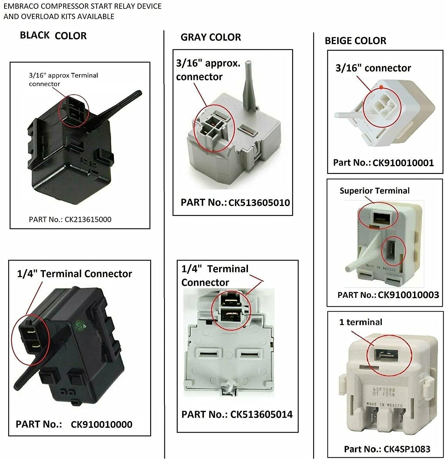 GlobPro CK513605014 Fits Embraco Compressor Start Relay 1/4 terminal old # 197D8031P001 Replacement for and compatible with GE Heavy DUTY Glob Pro Solutions register brand in process- Amazon don’t allow sell similar ***** Check options categorized by measures o connectors, this product have different numbers of parts . ***If you need faster see other options in check out,The part has 20 different part numbers like: CK513605014 if you have old serial number, the new part has new number and looks different of your old part but the new part is perfect fit for old and new serials PFS22MBSBBB,PFS22SISCSS,PFS22SISBSS,PFS22MISBWW,PFS22SBSBSS,PFS22MISABB,PFS22MISAWW,PFS22MISBBB,PFS22SBSASS,PFS22MBSAWW,PFS22MIWBBB,PFS22MBSBWW,PFS22MBWABB,PFS22MBWAWW,PFS22MBWBBB,PFS22MBWBWW,PFS22MIWBWW,PFS22SISASS,,,,,,,,,,,,,, and more.*****This part is perfect fit, you don’t need additional wire cables, terminal or glue, easy job 15 minutes average time, NON OEM Universal Replacement Part with OEM standards, replacement for and compatible with True, Beverage Air, Plased, Tecumseh, RCA, Estate Whirlpool, Monogram, Maytag GE Kenmore Samsung, Frigidaire,Amana, LG Miele and more.. those brands are just used like illustration, Models