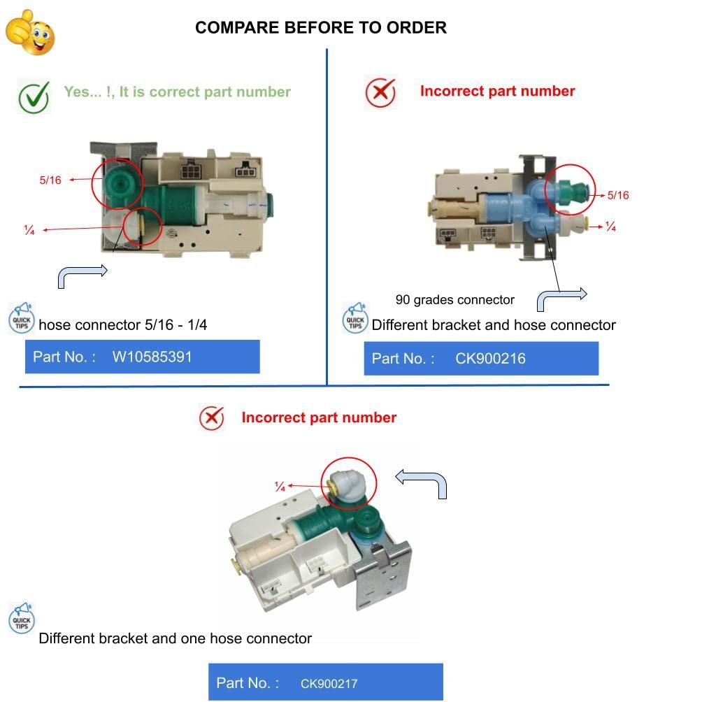 GlobPro W10585391 Ice Maker Water Inlet Valve 5" ½ length Approx. Replacement for and compatible with Whirlpool KitchenAid Heavy DUTY Glob Pro Solutions register brand in process- Amazon don’t allow sell similar ***** Check options categorized by measures o connectors, this product have different numbers of parts . ***If you need faster see other options in check out,The part has 20 different part numbers like: W10585391 if you have old serial number, the new part has new number and looks different of your old part but the new part is perfect fit for old and new serials 106.89582703, 106.89582704, 106.89582705, 106.89582706, 106.89583703, 106.89583704, 106.89583705, 106.89583706, 106.89589703, 106.89589704, 106.89589705, GI15NDXTB3, GI15NDXTB4, GI15NDXTQ3, GI15NDXTQ4, GI15NDXTS3, GI15NDXTS4, GI15NDXXB0, GI15NDXXB1 (), GI15NDXXQ0, GI15NDXXQ1 (), GI15NDXXS0, GI15NDXXS1 (), GI15NFLTB3, GI15NFLTB4, GI15NFLTS3, GI15NFLTS4, GI15NFLXB0, GI15NFLXS0, GI15NFRTB3, GI15NFRTB4, and more.*****This part is perfect fit, you don’t need additional wire cables, terminal or glue, easy job 15 minutes average time, NON OEM Universal Replacement Part with OEM standards, replacement for and compatible with True, Beverage Air, Plased, Tecumseh, RCA, Estate Whirlpool, Monogram, Maytag GE Kenmore Samsung, Frigidaire,Amana, LG Miele and more.. those brands are just used like illustration, Models