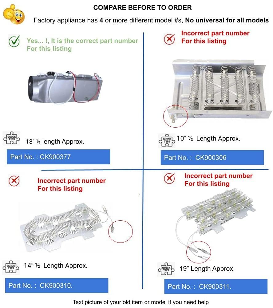 GlobPro WE11X10018 Dryer Heater 18" ¼ Length Approx. Replacement for and compatible with GE Heavy DUTY Glob Pro Solutions register brand in process- Amazon don’t allow sell similar ***** Check options categorized by measures o connectors, this product have different numbers of parts . ***If you need faster see other options in check out,The part has 20 different part numbers like: WE11X10018 if you have old serial number, the new part has new number and looks different of your old part but the new part is perfect fit for old and new serials DPGT650EH0MG,DPGT650EH0WW,,,,,,,,,,,,,,,,,,,,,,,,,,,,,, and more.*****This part is perfect fit, you don’t need additional wire cables, terminal or glue, easy job 15 minutes average time, NON OEM Universal Replacement Part with OEM standards, replacement for and compatible with True, Beverage Air, Plased, Tecumseh, RCA, Estate Whirlpool, Monogram, Maytag GE Kenmore Samsung, Frigidaire,Amana, LG Miele and more.. those brands are just used like illustration, Models